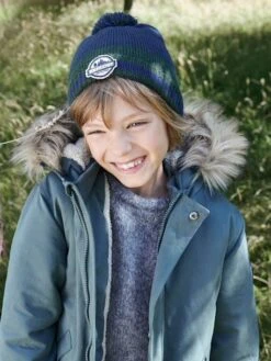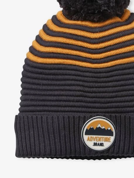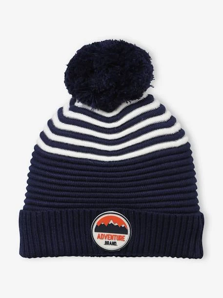 Un revers, des rayures, un pompon, une maille fantaisie, un badge cousu devant… on adore le style de ce bonnet !