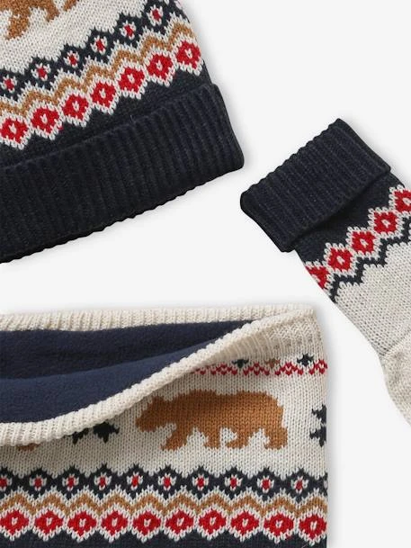 Des ours se baladent tranquillement sur cet ensemble en maille jacquard ! Dans leur coffret cadeau, ce bonnet, ce snood et ces gants feront vraiment plaisir à un petit garçon pour Noël… ou pour toute autre occasion !