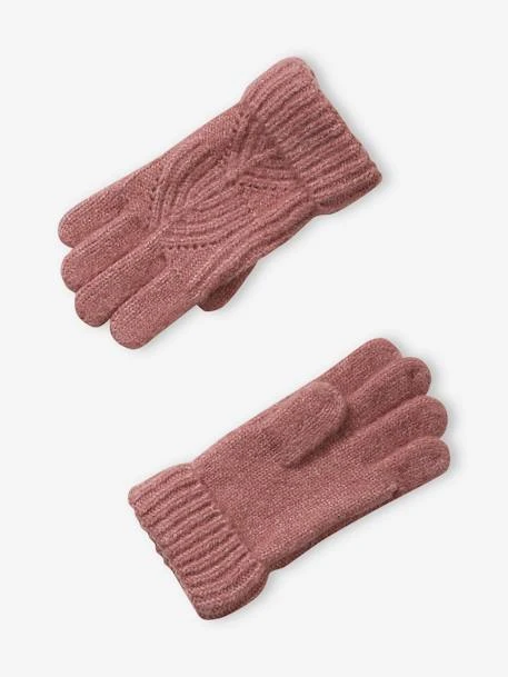 Ensemble bonnet + snood + moufles fille en maille torsadée mousseuse 60% polyester, 26% acrylique, 12% polyamide, 2% élasthanne.