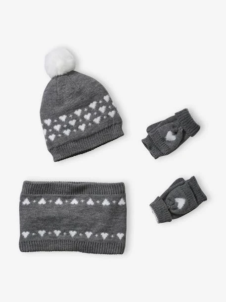 Ensemble bonnet + snood + mitaines fille en maille 100% acrylique, doublure 100% polyester.