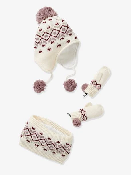 Avec sa belle maille jacquard aux jolies couleurs hivernales, cet ensemble bonnet, snood et gants réchauffera votre petite fille avec style !