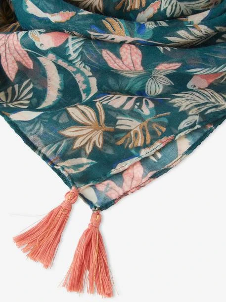 Votre petite fille pourra ajouter à ses tenues une touche d’exotisme avec ce joli foulard imprimé où se mêlent feuillages et oiseaux tropicaux : un style très dépaysant qui fait rêver !