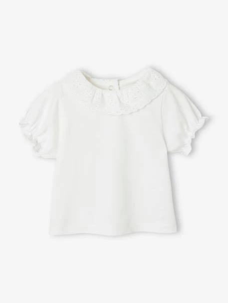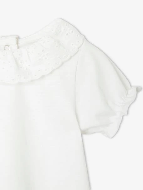 - Un T-shirt uni avec un col en broderie anglaise et manches ballon élastiquées