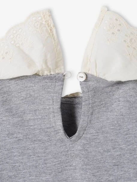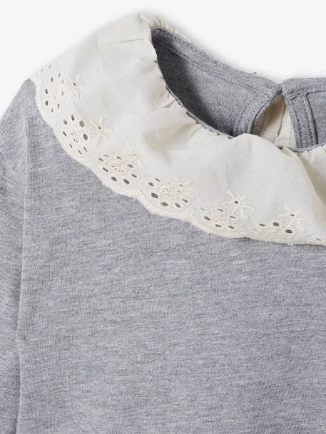 T-shirt bébé en jersey 85% coton, 15% viscose, col en broderie anglaise 100% coton.